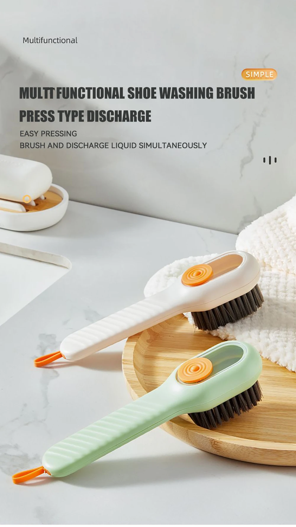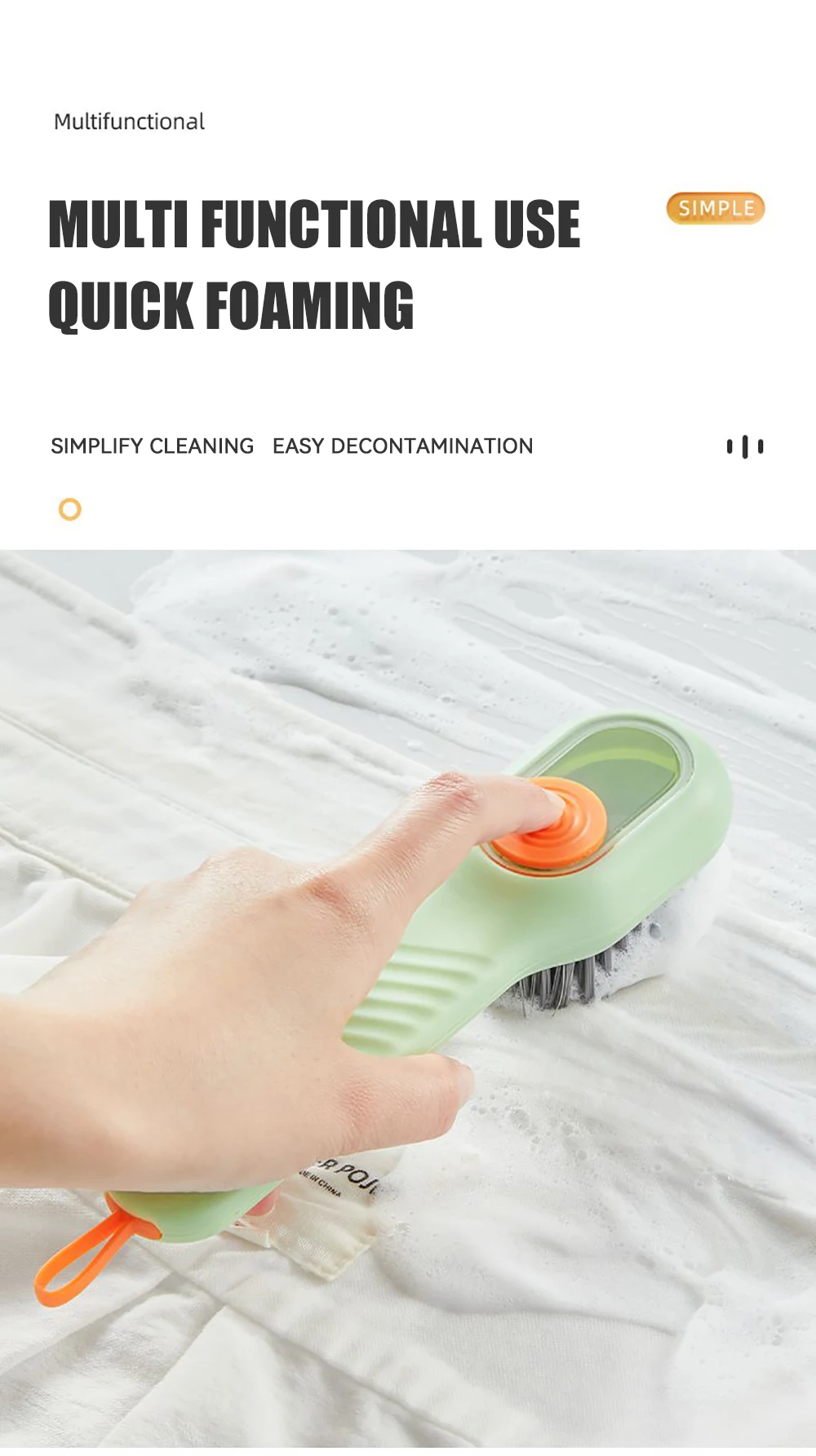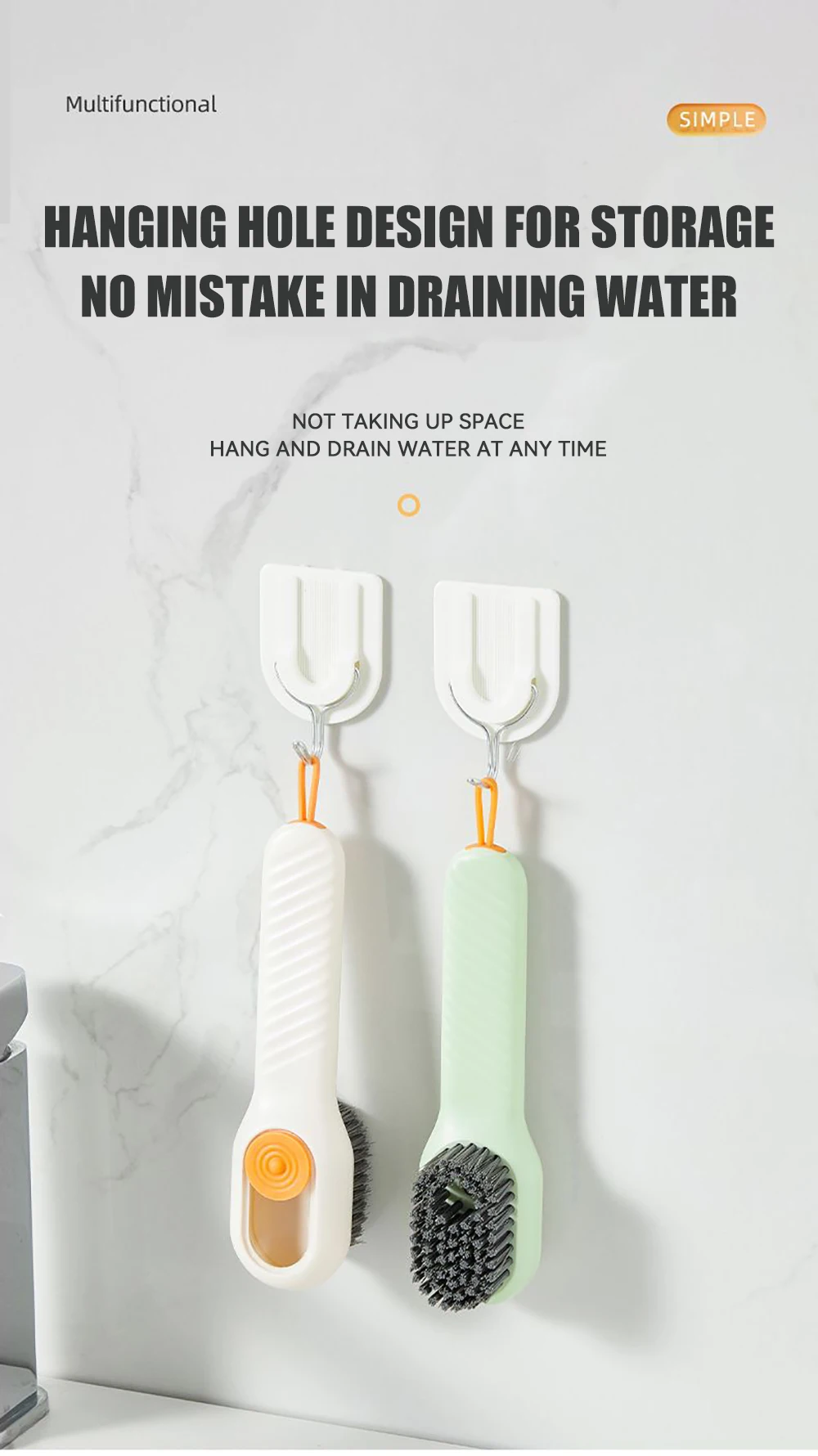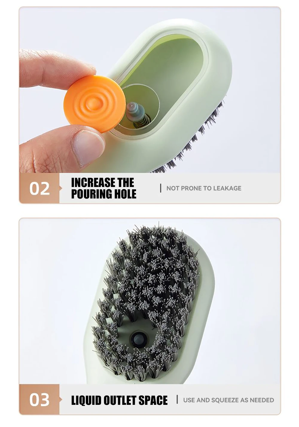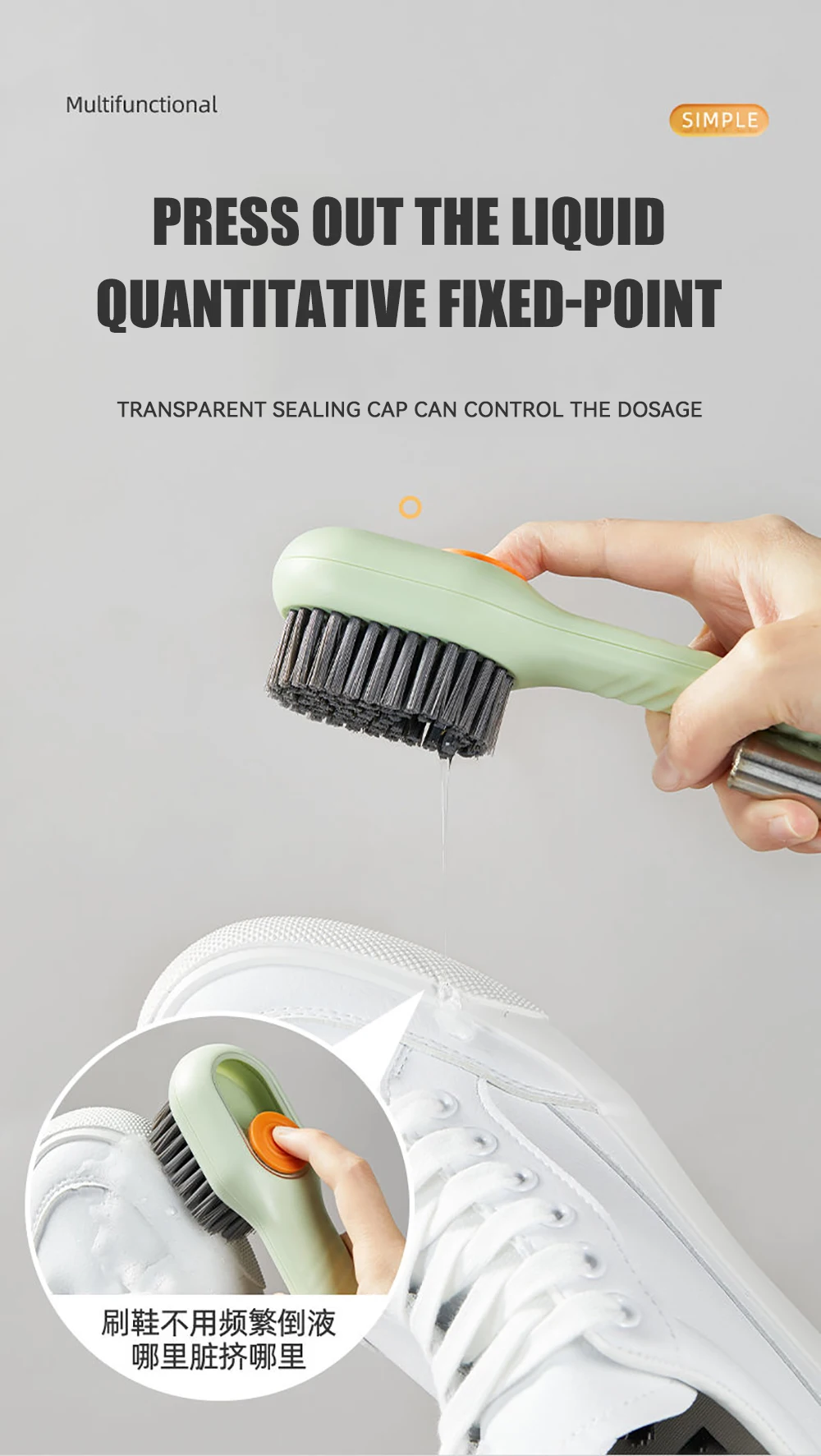 The cleaning brush with soap dispenser adopts a press-out liquid design, and there is a cleaning liquid reservoir on the back of the shoe brush, which can store more cleaning liquid and does not need to be replaced every time it is used; the storage of the soap dispenser brush is sealed design, so there is no need to worry about the cleaning liquid leaking; The hook design of the small cleaning brush makes it easy to hang it to dry after use.