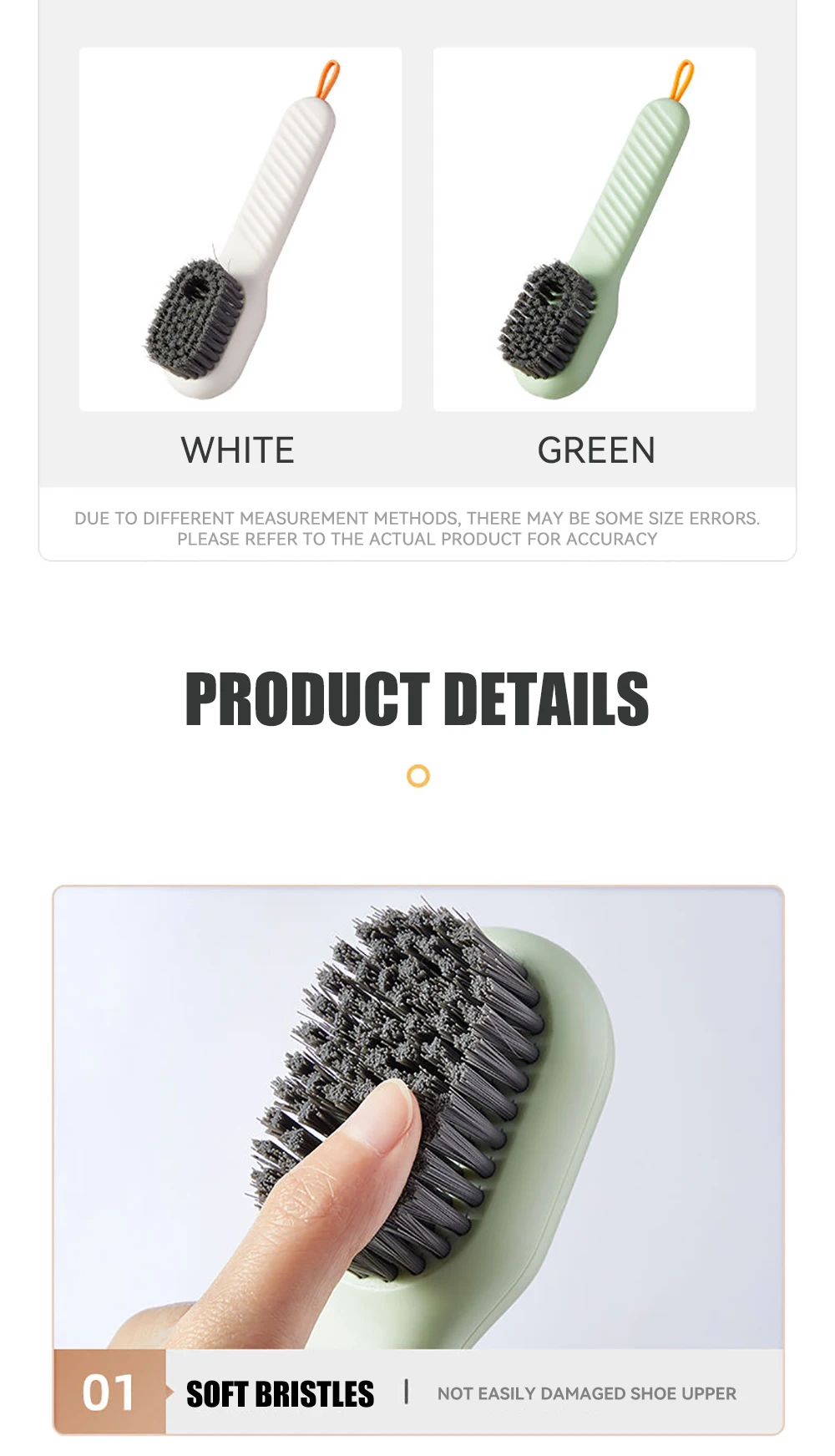 The cleaning brush with soap dispenser adopts a press-out liquid design, and there is a cleaning liquid reservoir on the back of the shoe brush, which can store more cleaning liquid and does not need to be replaced every time it is used; the storage of the soap dispenser brush is sealed design, so there is no need to worry about the cleaning liquid leaking; The hook design of the small cleaning brush makes it easy to hang it to dry after use.