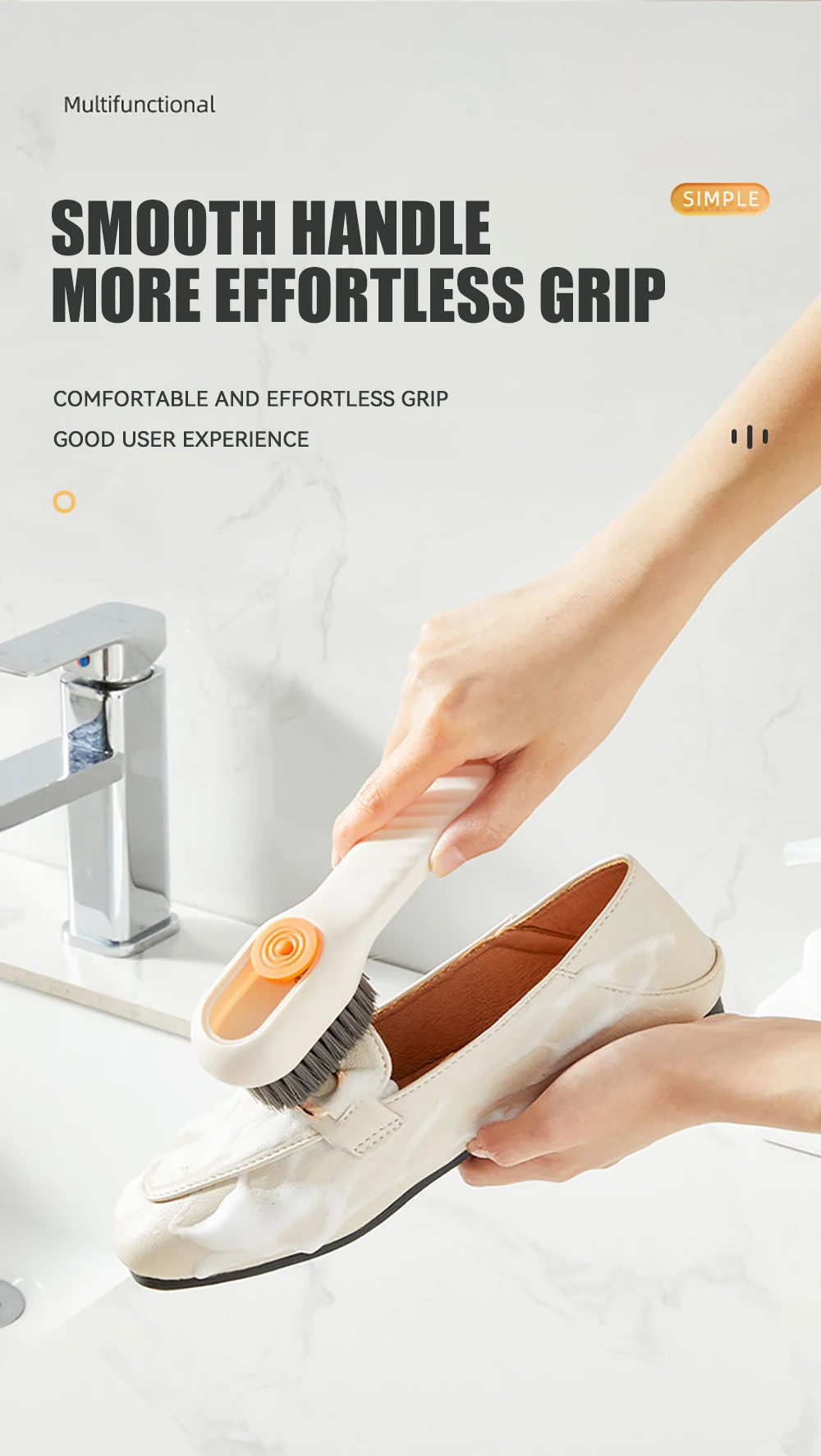 The rounded edge design of the shoe cleaning brush handle is comfortable to hold and will not feel tired after long-term use. When in use, pour the cleaning solution into the reservoir, aim at the position to be cleaned, gently press the cleaning solution to flow out, and then gently scrub to generate rich foam, which can deeply clean your shoes or clothes. This soft bristle cleaning brush can bring you a good experience.